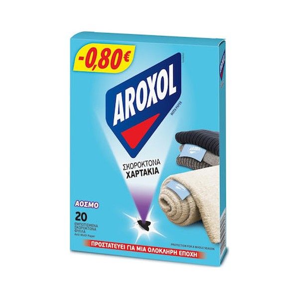 Η μορφή του AROXOL Moth Paper είναι σε χαρτάκια, εμποτισμένα με τη σκοροκτόνα ουσία Transfluthrin. Η διάρκεια δράσης του προϊόντος είναι 3 μήνες. To προϊόν είναι άοσμο. Τα χαρτάκια εξασφαλίζουν συνεχή, αλλά και αποτελεσματική καταπολέμηση του σκόρου. Η κύρια χρήση τους είναι για την προστασία χαλιών, όμως χρησιμοποιούνται και για την προστασία ρούχων που διατηρούνται σε κλειστούς χώρους, ντουλάπες ή συρτάρια.